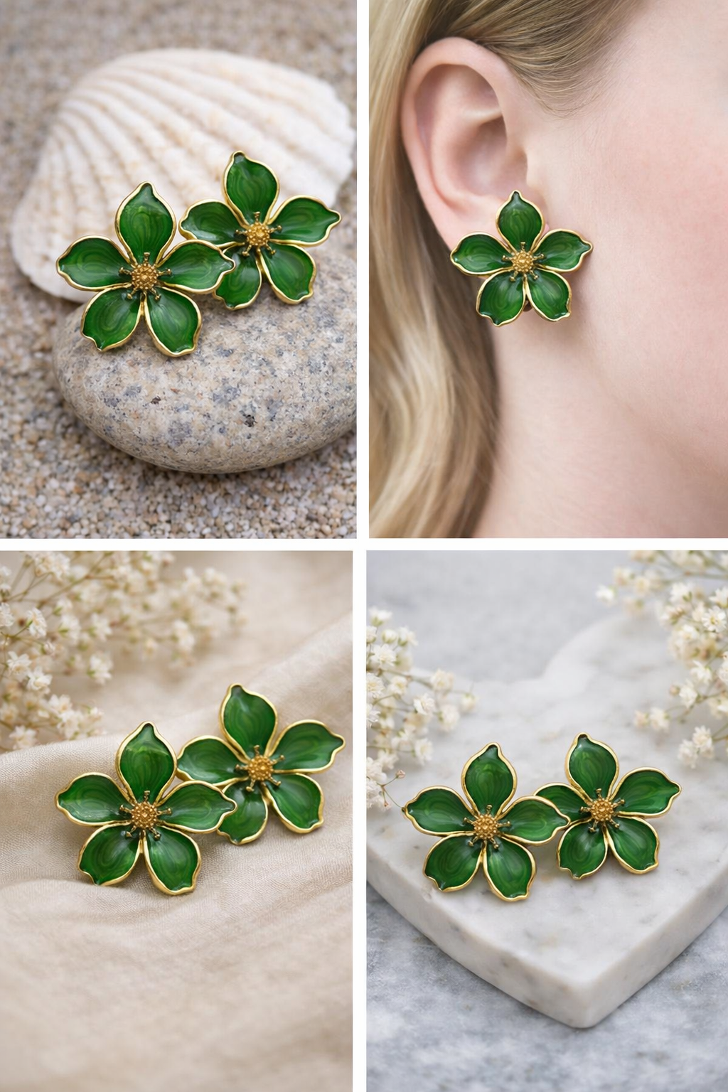 Bring nature’s elegance to your everyday style with the Emerald Bloom Stud Earrings. Designed in a delicate floral form, these studs feature rich green enamel petals outlined in a refined gold-tone finish, creating a perfect balance of softness and sophistication. The glossy center detail adds a subtle shine, making these earrings ideal for both daily wear and special occasions.