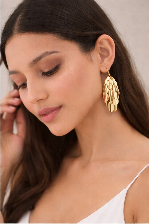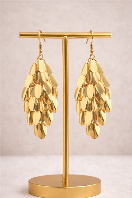 Make a striking style statement with these full-gold cascade shine earrings, designed to add effortless glamour and movement to your look. Featuring multiple layered, high-polish gold elements arranged in a flowing drop silhouette, these earrings reflect light beautifully with every step, creating a radiant and eye-catching effect.
